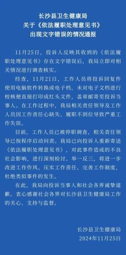 11月24日,湖南长沙县市民在社交媒体平台上晒出一份县卫生健康局向他出具的《依法履职处理意见书》,文件仅200余字,却有多达7处错别字。此事引发网民热议。