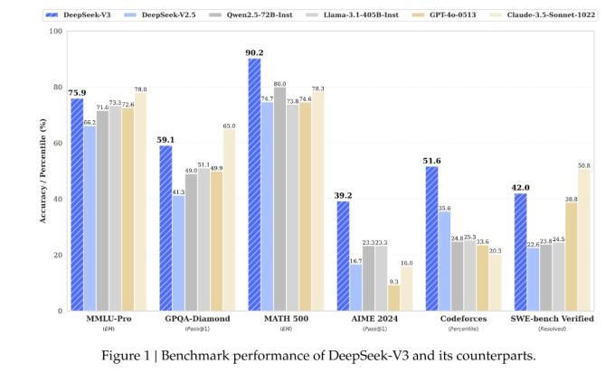 尤其在数学领域,DeepSeek V3在美国数学竞赛(AIME 2024)和中国全国高中数学联赛(CNMO 2024)的表现大幅领先所有开源闭源模型。
