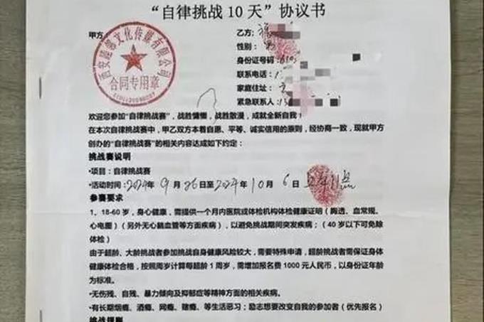 一家设在哈尔滨的自律挑战公司,将自律挑战包装成一场“战胜慵懒、成就自我”的考验,合同内不被允许的事项多达12条。
