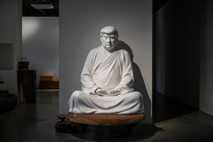 中国原创者洪金世在厦门的个人工作室内摆放着特朗普的陶瓷佛像雕塑。图摄于去年12月9日。(法新社)