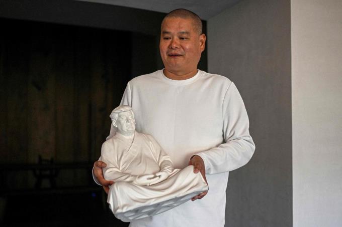 中国雕塑家洪金世在厦门的个人工作室内,捧着一座特朗普陶瓷佛像雕塑。图摄于去年12月9日。(法新社)