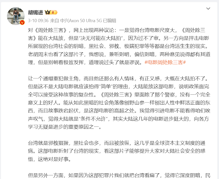 对于网民的热烈讨论,《环球时报》前总编辑胡锡进3月10日在微博点评称,《周处除三害》能在大陆上映,说明政策面完全可以接受这种故事的复杂性。