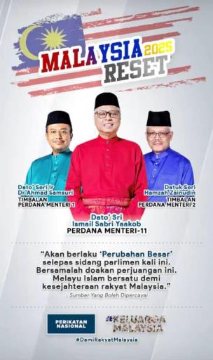 与此同时,网上流传一张以“2025年马来西亚重置”(Malaysia Reset)为题的海报,海报正中央是依斯迈的肖像,写着他是马国第11任首相,两侧则是“第一副首相”伊斯兰党副主席阿末山苏里,以及“第二副首相”土团党署理主席韩沙再努丁。