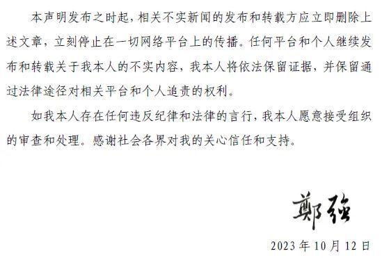 本声明发布之时起,相关不实新闻的发布和转载方应立即删除上述文章,立刻停止在一切网络平台上的传播。任何平台和个人继续发布和转载关于我本人的不实内容,我本人将依法保留证据,并保留通过法律途径对相关平台和个人追责的权利。