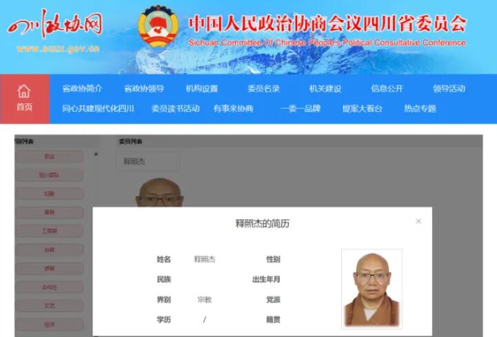 在四川省政协官网“委员列表”栏中,释照杰为宗教界委员,其简历中“姓名”“界别”分别显示为“释照杰”和“宗教”,包括“性别”“出生年月”“学历”“籍贯”在内的信息均没有介绍。