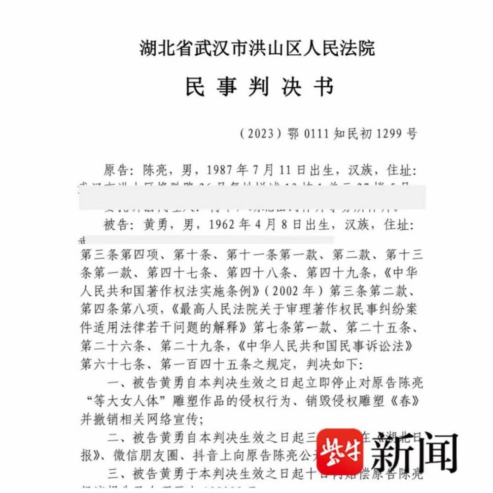 12月8日,扬子晚报/紫牛新闻记者从“湖北美院退休教师被指抄袭学生雕塑作品案”当事人陈亮处了解到,近日武汉市洪山区人民法院已对该案做出一审判决。抄袭学生作品的教师黄勇被判侵权,需在判决生效之日起停止侵权行为、销毁侵权雕塑《春》,并在一个月内通过报纸、微信朋友圈和抖音账号向被侵害学生致歉,同时还需承担10万元的赔偿。