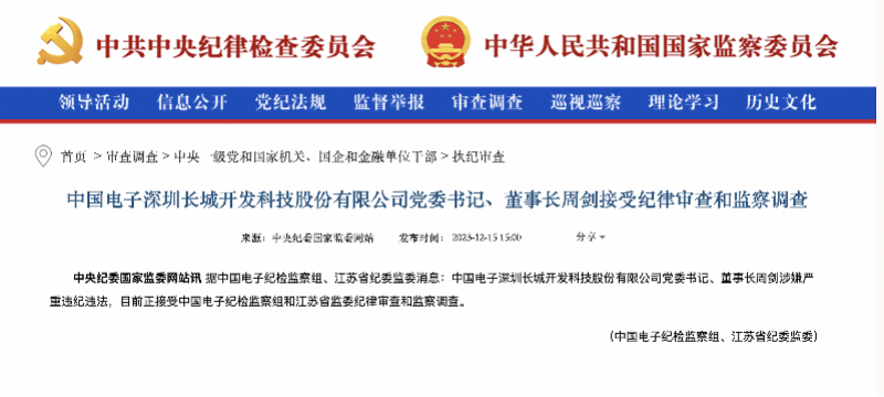 据中国电子纪检监察组、江苏省纪委监委消息,中国电子深圳长城开发科技股份有限公司(以下简称:深科技,股票代码:000021.SZ)党委书记、董事长周剑涉嫌严重违纪违法,目前正接受中国电子纪检监察组和江苏省监委纪律审查和监察调查。
