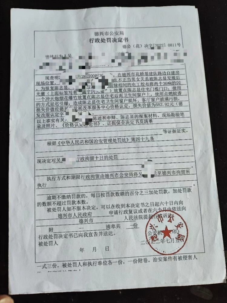 德兴市公安局行政处罚决定书显示,2022年5月28日零时30分许,在德兴市花桥基建队路边自建房现场位置,吴某某与陈志显妻子余华存在不正当男女关系被陈志显发现后,为报复陈志显,吴某某与余华使用黄绿相间的电工胶布将两个36响的闪光蕾放置在陈志显住宅门槛门口;使用一个冲天炮烟花爆竹放置在陈志显住宅后面卫生间窗户上,使用点燃蚊香的方式延迟引爆,造成陈志显住宅卫生间窗户损坏、客厅窗户玻璃污损。经德兴市发展改革服务中心价格认定,损失价值为582.92元。