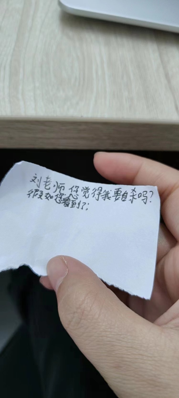 经法院审理查明,在新学期开学返校第二天,2023年2月7日14时30分,班主任刘某在教室后面的老师办公桌发现了一张匿名纸条,上面写着“刘老师,您觉得我要自杀吗?假如您看到了”。