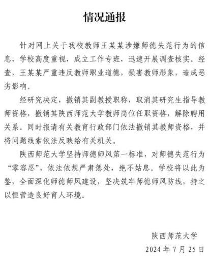 陕西师范大学7月25日发布情况通报:针对网上关于我校教师王某某涉嫌师德失范行为的信息,学校高度重视,成立工作专班,迅速开展调查核实。经查,王某某严重违反教师职业道德,损害教师形象,造成恶劣影响。