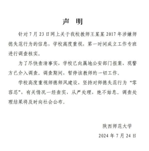 7月24日晚上,陕西师范大学发布声明称,针对网上关于教师王某某2017年涉嫌师德失范行为的信息,学校高度重视,第一时间成立工作专班进行调查核实。为了尽快查清事实,学校已向属地公安部门报案,现警方已介入调查。调查期间,暂停该教师的一切工作。