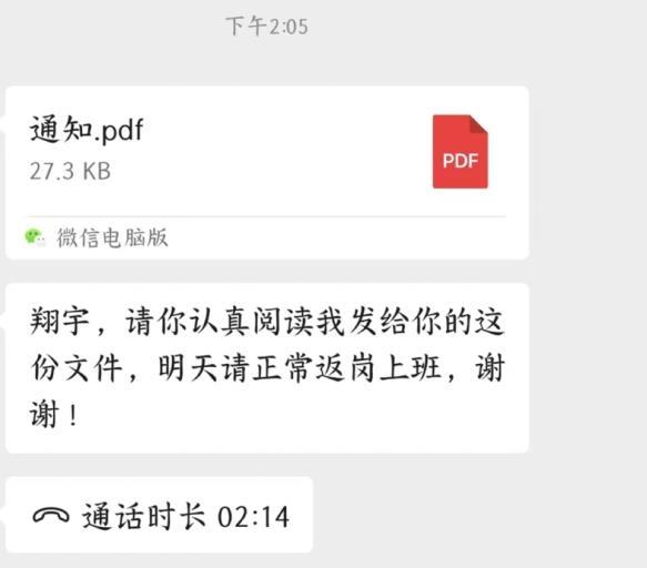 记者了解到,该返岗通知由孙静霞通过微信发送给马翔宇。在马翔宇提供的录音文件中,孙静霞表示“组织部门正在针对你(马翔宇)反馈的信息作全面的核实、核查,我们要求全体工作人员正常返岗上班、在岗,根据组织部门的需要及时配合相关情况核实、核查。”而马翔宇则在电话中强调“我在等待调查组的通知”。