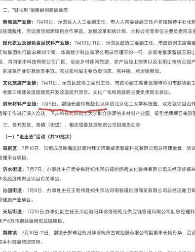 济源市政府网站发布的《济源示范区招商引资周动态(2024年第29期)》显示,在“链长制”招商组动态中,纳米材料产业链副链长翟伟栋于7月5日赴北京拜访北京化工大学科技园,双方就项目合作、园区招商等工作进行深入洽谈,下步将在北京化工大学推介济源纳米材料产业园,吸引优质项目来济落地。