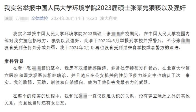 现代快报讯(记者 陈云龙)8月14日下午,网友万某某实名发帖举报称,自己于2021年12月至2022年3月间,被中国人民大学环境学院2023届硕士张某某殴打、猥亵、强奸,在同年6月向校方举报、向警方报警后,直至今日张某某未受到处罚。现代快报记者了解到,张某某目前就职于南方电网资本控股有限公司,公司工作人员回应:“已关注到该情况,正在按规定处理,将以公安机关调查结果为准。”