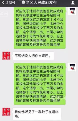 2018年,安徽池州某学校教师在“贵池区人民政府发布”微信平台反映校园生活补贴发放的问题,得到的回复却是讥讽感满满的“不说话没人把你当哑巴”;该教师再重新发送信息后,回来的又是一句“我仿佛听见了一群蚊子在嗡嗡嗡”。