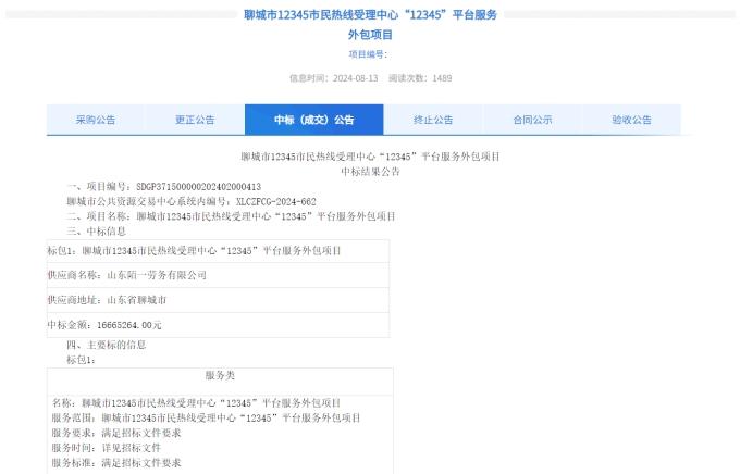 山东省聊城市8月13日宣布,将该市12345热线受理中心项目外包给一家名为山东陌一的劳务公司,中标金额为1666万元(人民币,下同,305万新元),合同履行期限一年。