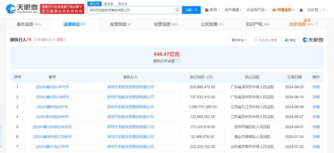 天眼风险信息显示,深圳市宝能投资集团有限公司现存78条被执行人信息,被执行总金额超446亿元,此外还存在多条限制消费令、失信被执行人(老赖)和终本案件信息。