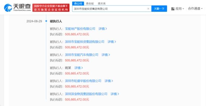 天眼查法律诉讼信息显示,近日,深圳市宝能投资集团有限公司、宝能地产股份有限公司、深圳市宝能汽车有限公司、姚振华等新增一则被执行人信息,执行标的5.05亿余元,执行法院为广东省深圳市中级人民法院。