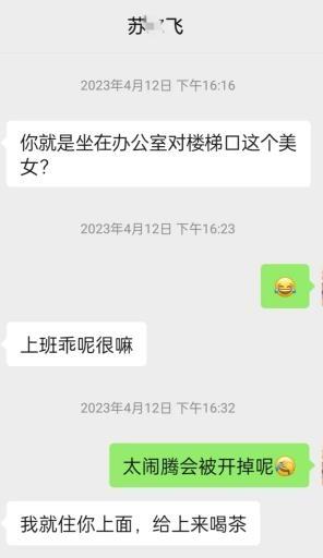 刘薇提供的聊天记录显示,2023年4月12日,一个备注为“苏某飞”的账号连续发来“你就是坐在办公室对楼梯口这个美女?”“上班乖呢很嘛”“我就住你上面,给(可)上来喝茶”等多条消息。2024年6月的产科检查报告显示,当事人宫内早孕8周。
