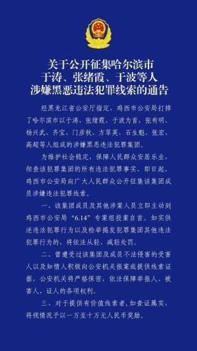 央视新闻10月22日消息,近日,黑龙江省鸡西市警方发布“关于公开征集哈尔滨市于涛、张绪霞、于波等人涉嫌黑恶违法犯罪线索的通告”。