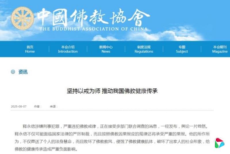 释永信的严重问题为全国佛教界敲响了警钟。唯有勇于面对、深刻反省,举一反三、引以为戒,才能把问题和错误转变为促进佛教徒个人修行进步和推动佛教健康传承的“逆增上缘”。中国佛教协会坚决拥护和支持有关部门对释永信的依法查处,从释永信问题中深刻汲取教训,纵深推进全面从严治教,始终坚持以戒为师,深入挖掘、阐释、弘扬佛教经典中倡导以戒为师、勤修三学的内容,向历代严持净戒、精进修行的高僧大德学习,努力营造学戒、持戒、弘戒的良好风气,教育引导佛教教职人员深刻认识“以戒为师”的重要意义,像爱护眼睛一样守护戒律,进一步健全完善教职人员监督管理制度机制,坚决惩戒违规犯戒教职人员,坚决清除教职人员队伍中的害群之马,坚定维护佛教健康肌体和清净庄严形象,推动我国佛教健康传承。