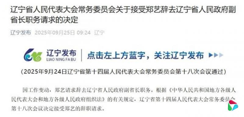 9月25日,据辽宁发布,因工作变动,郑艺请求辞去辽宁省人民政府副省长职务。根据《中华人民共和国地方各级人民代表大会和地方各级人民政府组织法》的有关规定,辽宁省第十四届人民代表大会常务委员会第十八次会议决定接受郑艺的辞职请求。