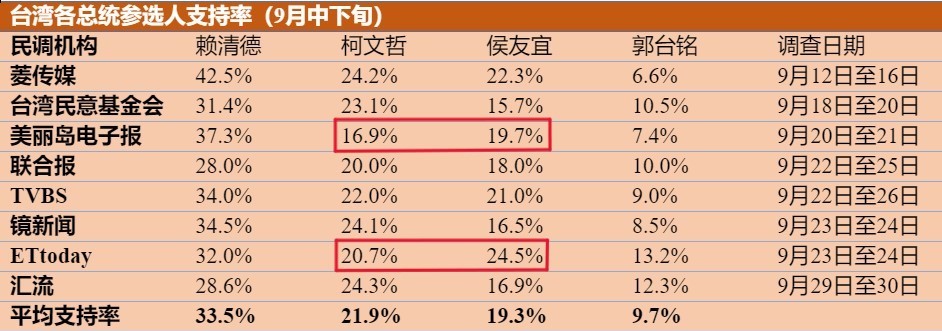 虽然柯文哲近几个月因争议缠身导致民调下滑,在9月中下旬展开的八份民调,柯文哲有六份排在侯友宜前头。平均下来,柯文哲民调领先侯友宜2.6个百分点。