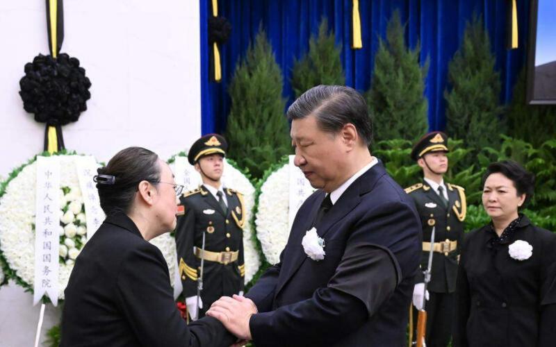 央视新闻画面显示,中国官方和夫人彭丽媛在哀乐声中面向遗体三鞠躬,随后缓步绕行瞻仰李克强遗容,并与李克强遗孀程虹握手。