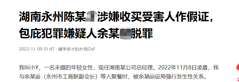 该网友发帖称自己未婚,现任湖南某公司总经理,2022年11月8日凌晨与余某某(永州市工商联副会长)等人聚餐时,被余某某设局强行发生性关系。事后,当事人第一时间向公安机关报案,嫌疑人余某某被公安机关刑事拘留。