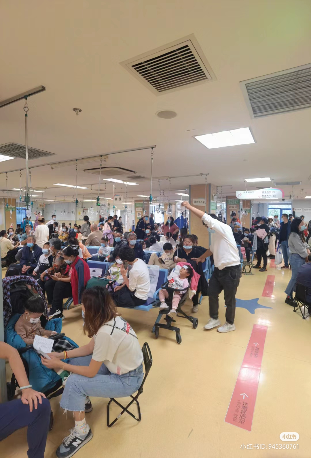 北京市儿童医院本月初通报,该院每天接诊的呼吸道感染病例达3500至3600人,急诊甚至挂到3000号、各科室的输液室、诊疗室几乎全部爆满,还有不少患儿坐在家长自备的折叠椅上,在医院走廊吊点滴。