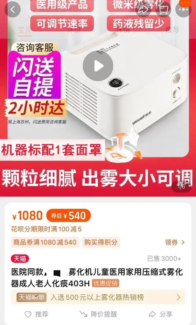 不少家长为了给患病的孩子做雾化治疗,纷纷到线上电商平台抢购家用雾化器,促使家用雾化器的销量猛涨,有的店家甚至近一个月就卖出2万多台。