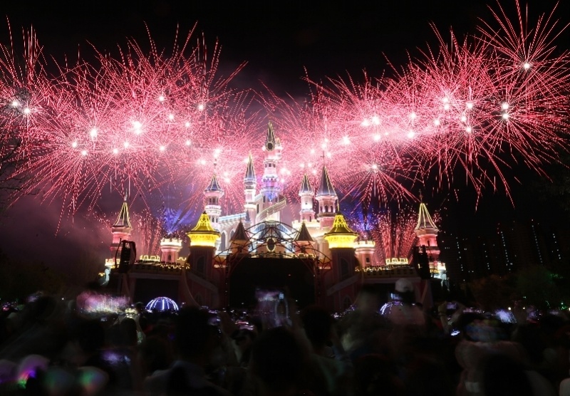 2023年5月1日,游客在沈阳方特欢乐世界观赏烟花表演。  新华社记者 龙雷 摄