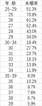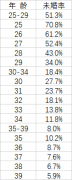 分具体年龄来看,25岁人群的未婚率为70.8%;26岁人群的未婚率为61.2%;27岁人群未婚率为52.4%;28岁人群未婚率降至50%以下,为43%;29岁人群未婚率为34%,也就是说,29岁人群中,大约每3个人有1个未婚。