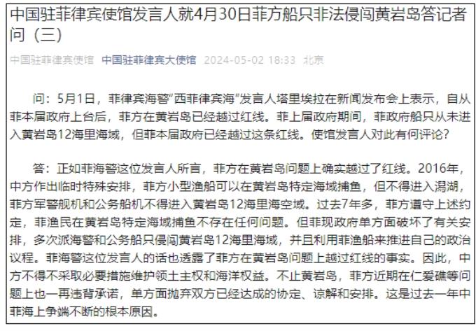 微信公众号“ 中国驻菲律宾大使馆”消息,中国驻菲律宾使馆发言人就4月30日菲方船只非法侵闯黄岩岛答记者问。