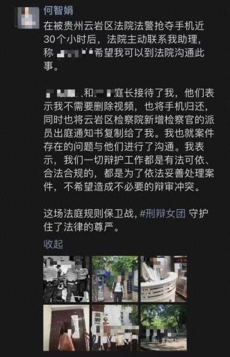 7月2日,“刑辩女团”公众号发布《何智娟律师关于被法警暴力执法的声明》一文,称休庭期间遭法警阻止拍摄等,引发关注。