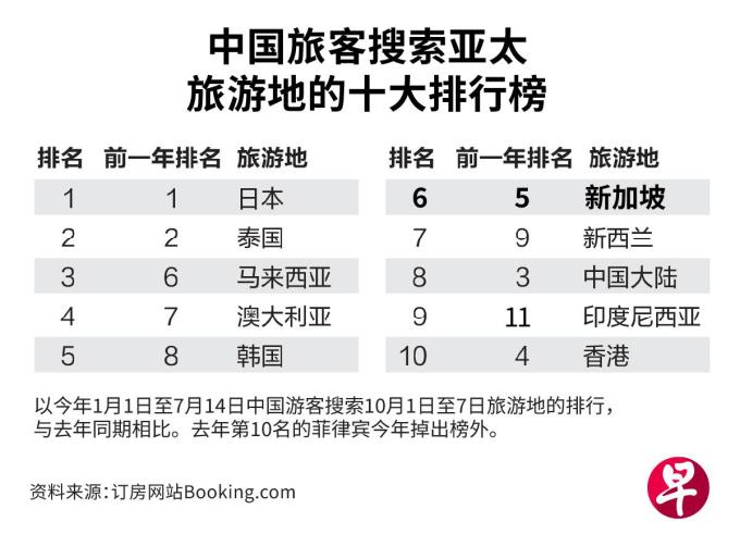 国际订房网站Booking.com日前公布,在中国旅客搜索亚太旅游地的十大排行榜中,中国大陆境内旅游从第三名掉到第八名,新加坡微跌一名至第六名,保住十大的宝座。与此同时,马来西亚从第六名升到第三名、泰国维持第二名。