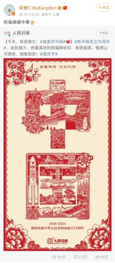 中国“十一”国庆当天,刚进军大陆影视圈的台湾男影星吴慷仁,转发了中共中央机关报《人民日报》庆祝国庆的微博,并配文:“祝福锦绣中华”。