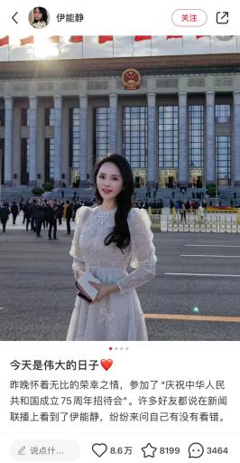 伊能静10月1日在社媒平台晒出自己出席国庆招待会的照片,并发长文叙述当晚见闻和感想。她在文中引述官方领导人的讲话内容,并回忆自己近年来嫁给东北汉子,从台北改为定居上海,“深刻体会到了祖国的包容、多元和多样性”。文章最后以“敬爱的祖国,生日快乐”结尾,被网民称赞为“顶级考公申论”。