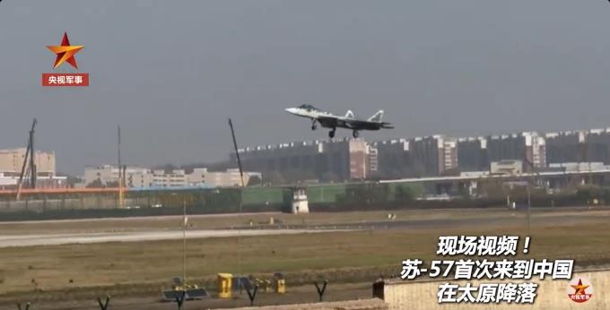 视频搭配的贴文写道,“今天14时20分许,隐形战机苏57降落太原,这是苏-57首次来到中国”,同时附上标签“直击第十五届中国航展”。