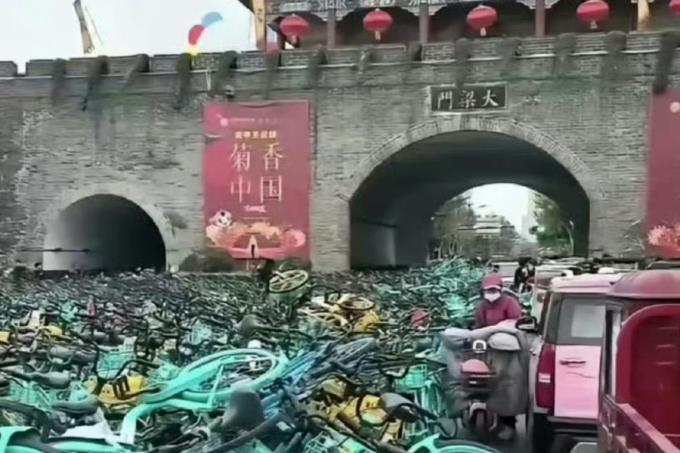 开封地标建筑大梁门门前星期六上午堆满了被遗弃的共享单车。(互联网)