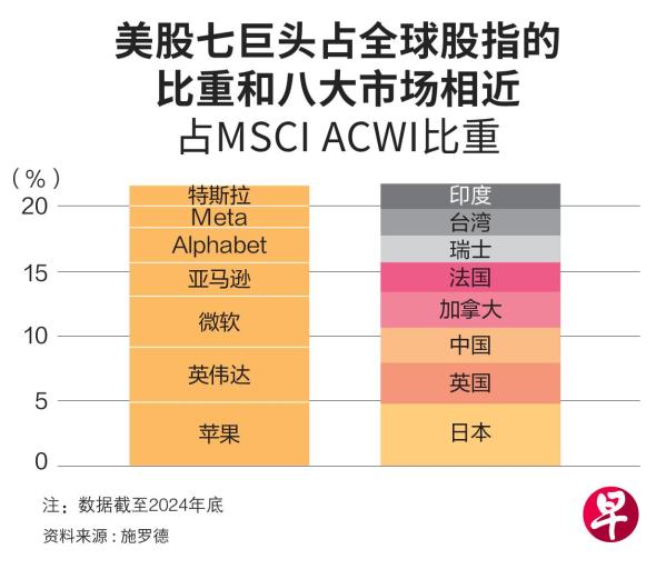 根据MSCI全球可投资市场指数(MSCI ACWI)截至去年底的数据,美股七巨头所占比重,相当于美国以外八大市场所占的比重。这个指数是MSCI覆盖范围最广泛的市场指数。