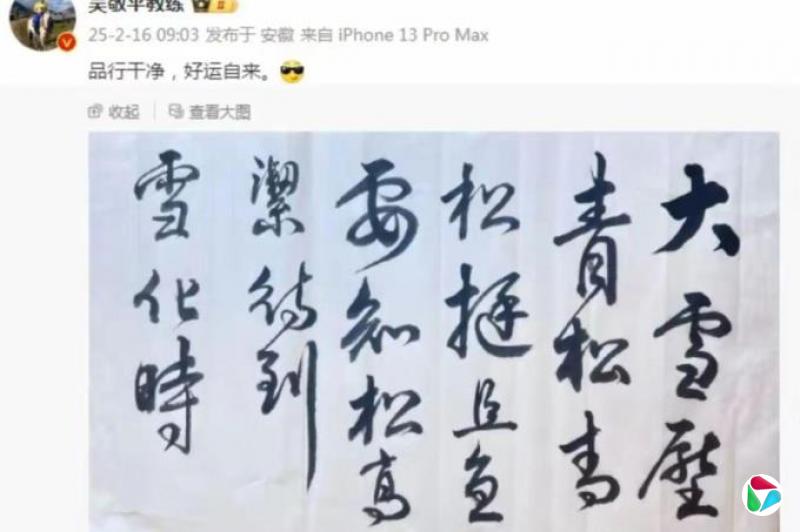 遭尹肖驳斥后,吴敬平在微博晒出一幅书法作品,内容是已故中共元老陈毅的《青松》诗句:大雪压青松,青松挺且直,要知松高洁,待到雪化时。他在配文中写道:“品行干净,好运自来。”