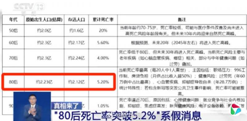 李婷指出,这些数据所引述的第七次人口普查的调查时间范围是2020年,显然无法预测2024年的死亡率;且人口普查不针对特定群体,因此不可能会出现80后群体的死亡率数据。