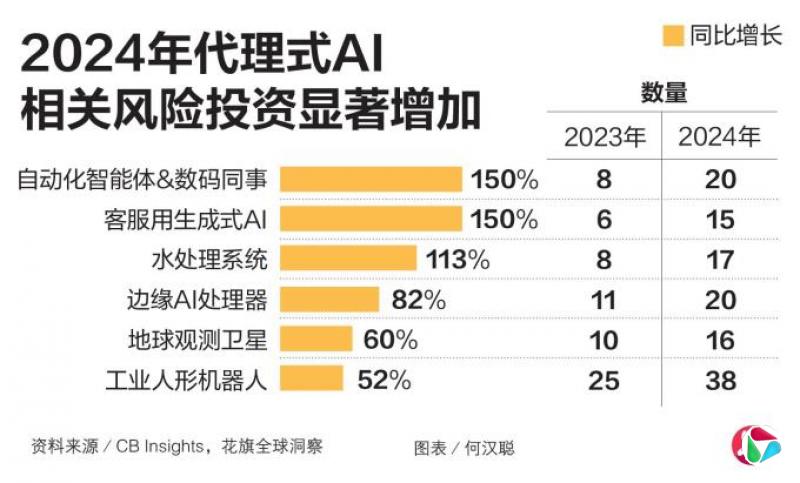 CB Insights研究称,有37%的风投资金在2024年流向AI起步公司,创下新高。其中,投资活动增长最显著的是自主代理与“数字同事”(Autonomous agents & Digital co-workers),去年共20宗,同比增幅达150%。
