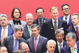 李嘉诚次子、盈科拓展集团主席李泽楷(后排右一)星期天在北京以中方企业代表身份出席中国发展高层论坛,并同中国总理李强及其他与会人士合照。(中新社)
