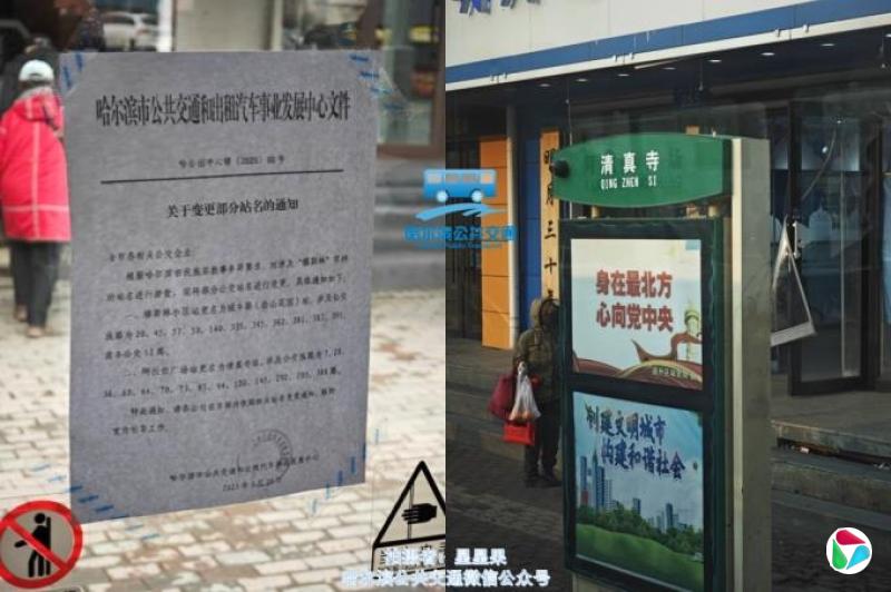 微信公众号“哈尔滨公共交通”3月31日、4月2日先后发布两则图文,显示黑龙江省会哈尔滨两个相隔10多公里的公交站更名,其中城西南的“穆斯林小区站”更名为“城乡路(金山花园)站”,城东北的“阿拉伯广场站”更名为“清真寺站”。