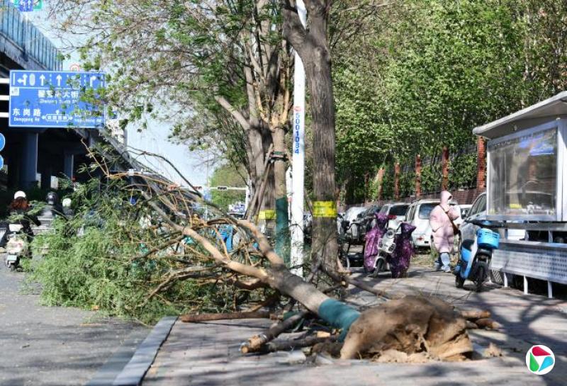 4月12日,河北石家庄一棵大树被大风连根拔起。(中新社)