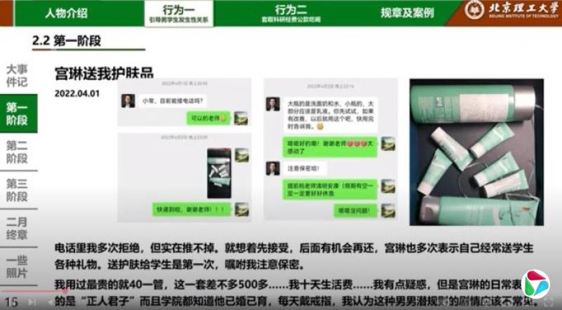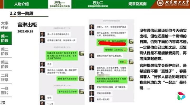 在PPT中,常旭强巨细靡遗地披露与宫琳从相识到出柜的点滴,还公开相关录音。爆料时间跨度从2022年11月至2024年1月,内容主要分为四部分,包括对宫琳进行人物介绍、“引导男学生发生性关系”“套取科研经费公款吃喝”等。