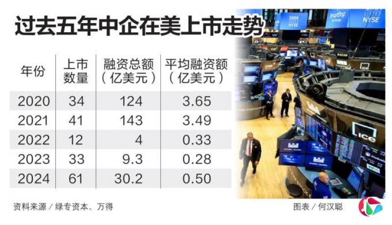 尽管2024年中概股挂牌数量回升至61家,但平均IPO融资额仅为5000万美元,远低于2021年超过3亿美元的水平。