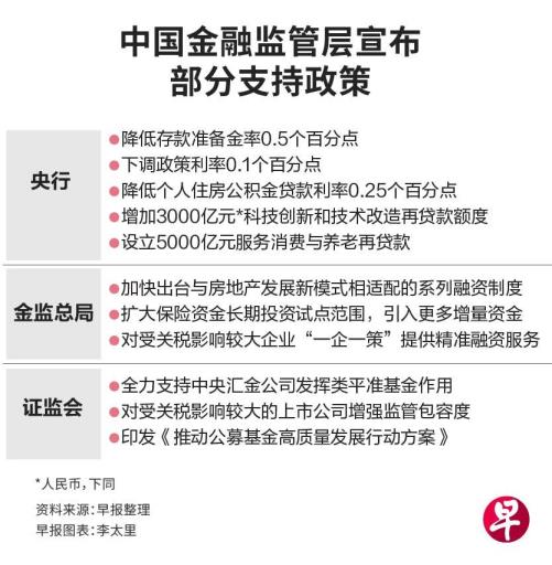 中国金融监管层推出降准降息等一系列支持政策,缓冲中美贸易战对实体经济、资本市场和房地产等行业的影响,中国大陆和香港股市应声回弹但涨幅受限。分析指出,本轮新政力度没有超过去年9月的宣布,须进一步加码刺激方能提振市场预期。